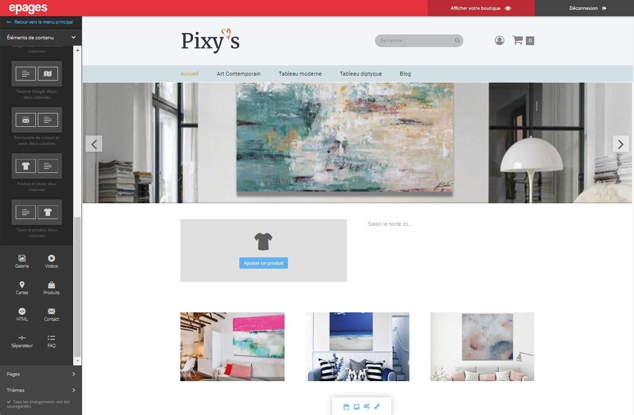 En glisser-déplacer, vous ajoutez des élements de contenu: banners, fiche produit, photos, textes, videos, google maps, fomulaire de contact, etc...